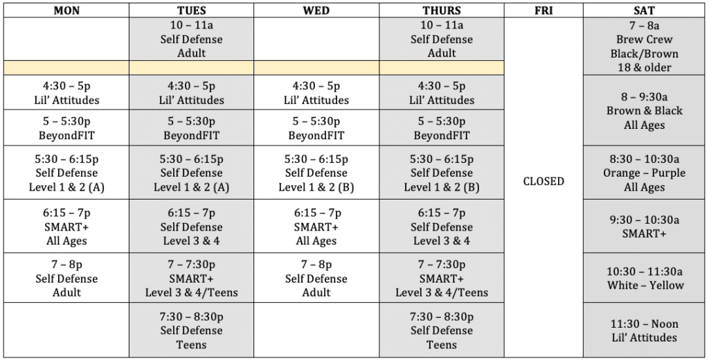 Class Schedule: At Attitude First we pride ourselves on giving flexibility to our members (and parents). We want our members to train as much as they like, so we have unlimited memberships for self-defense (doesn’t include yoga and BJJ). An unlimited membership means if a member can take all of the age/rank appropriate classes EVERY week without it costing any more! It is a perfect way for a member to achieve their goals through the martial arts.